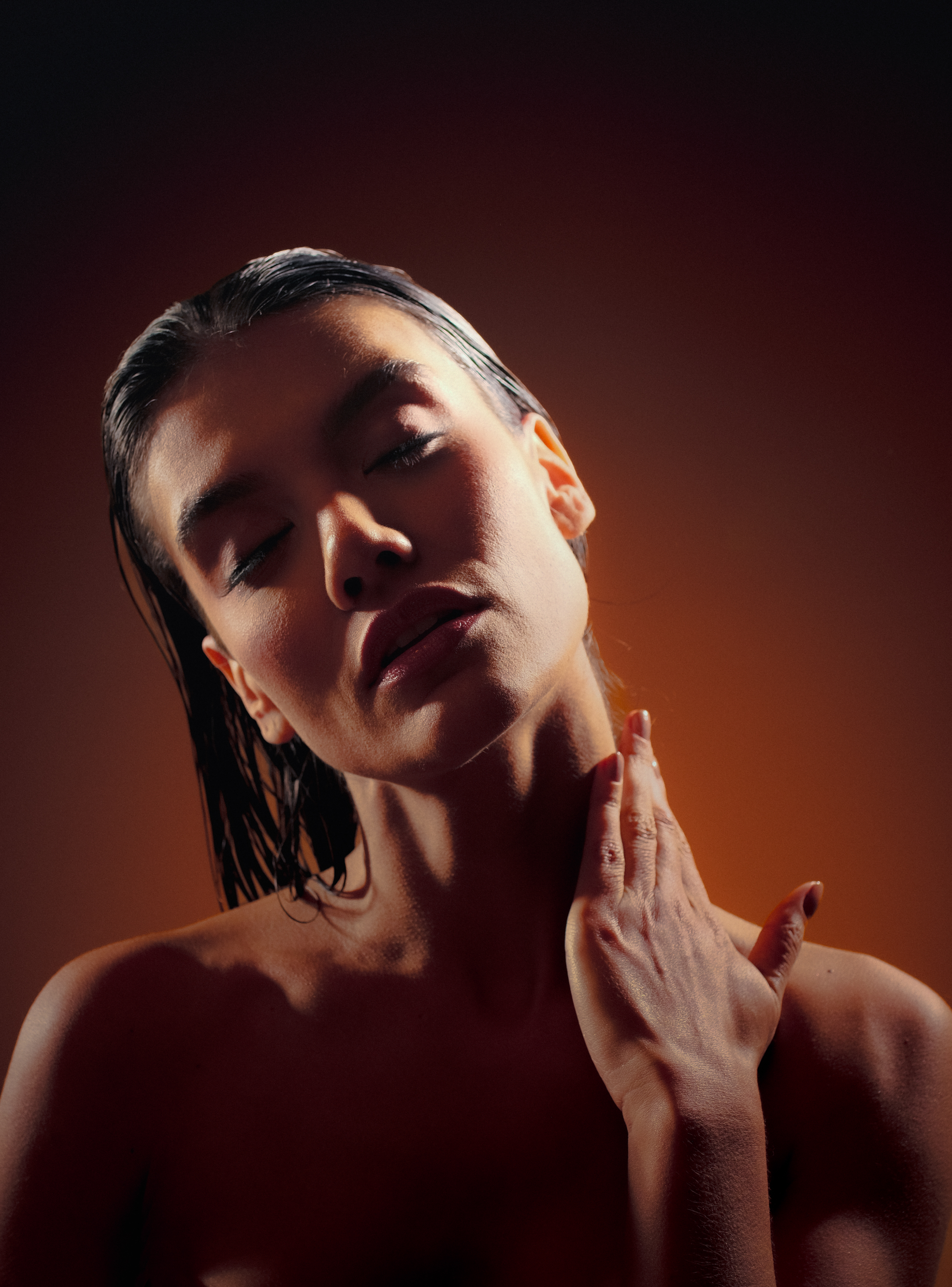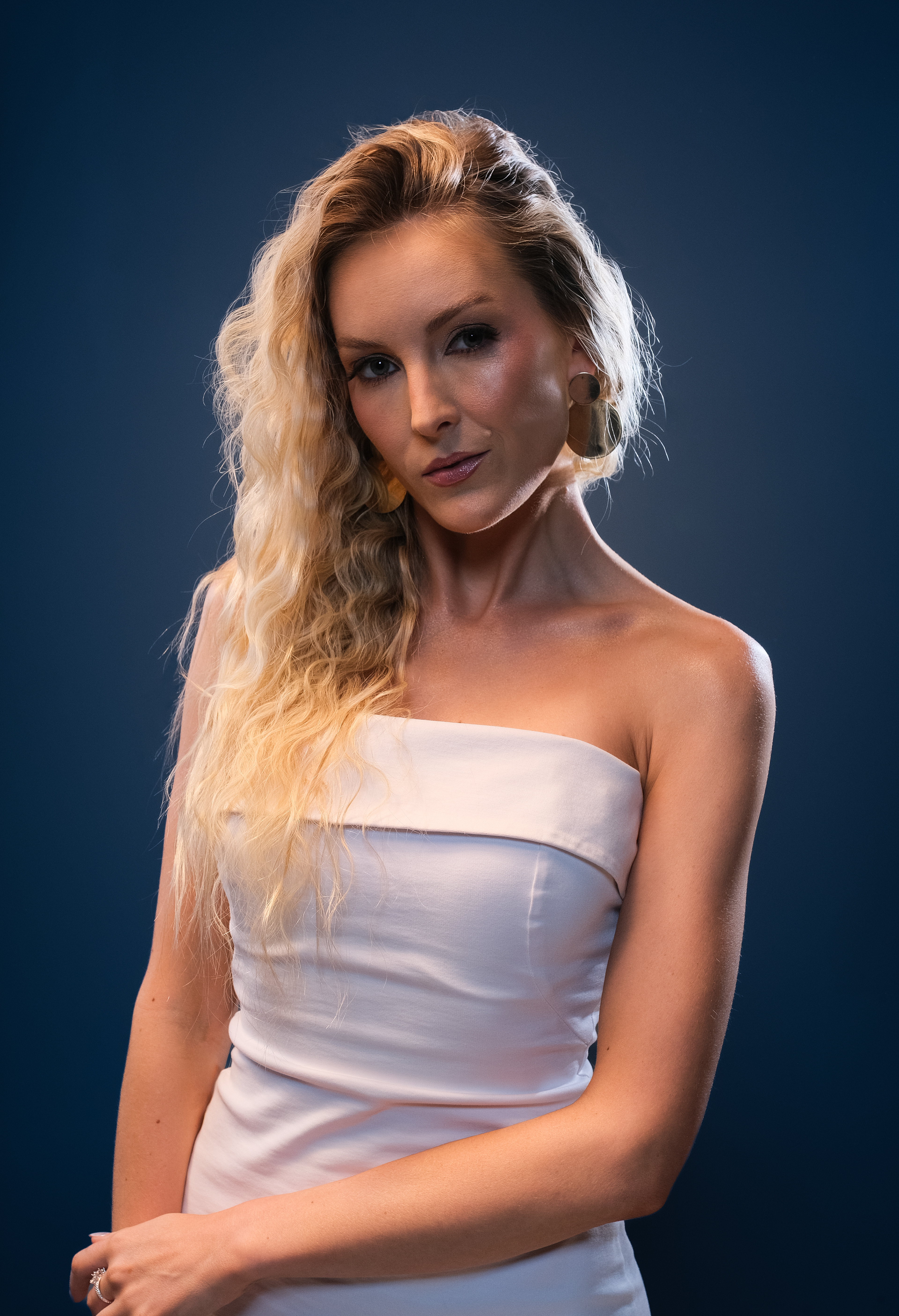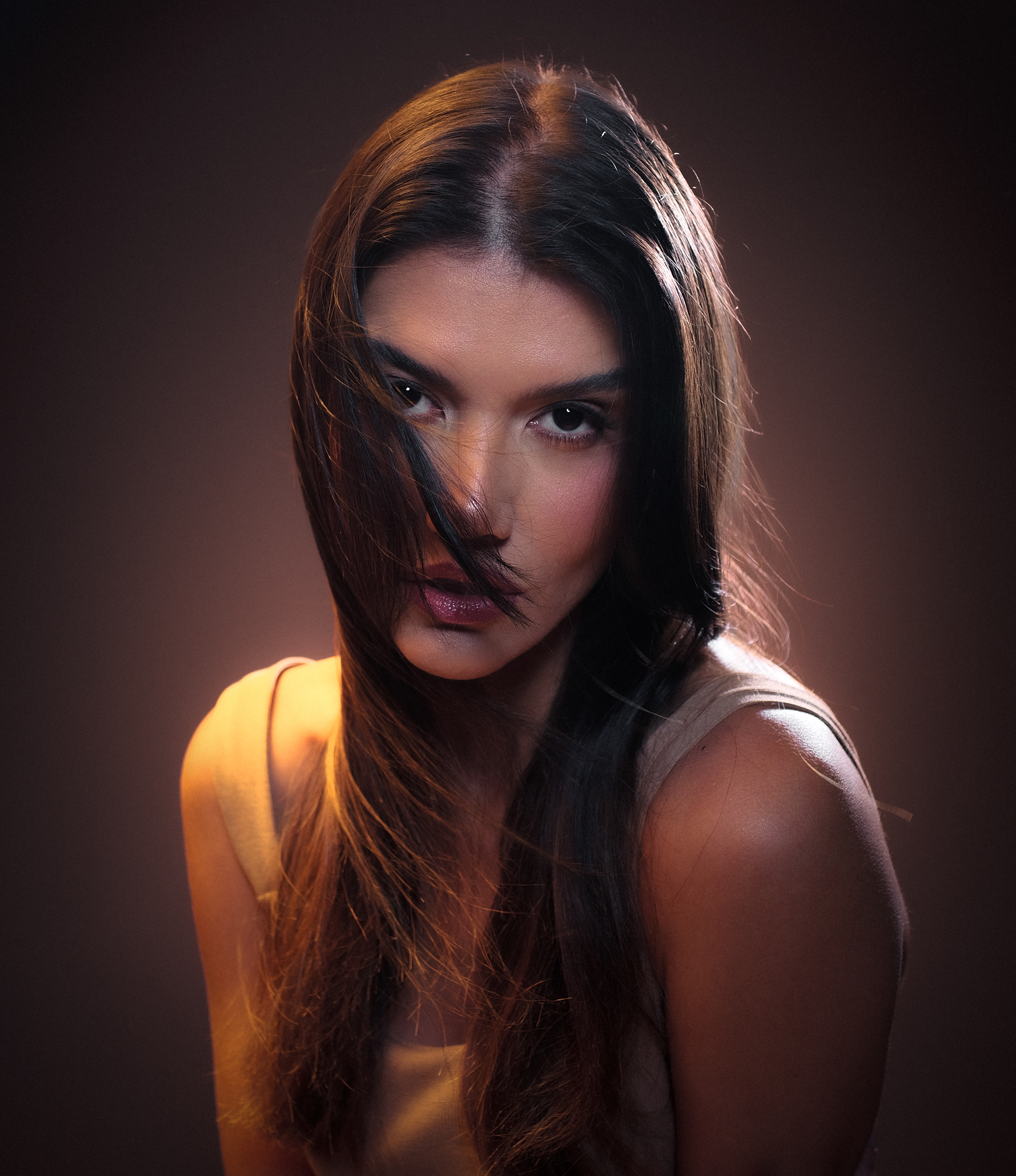 Nos setups de iluminação, optei por utilizar luzes duras como recortes e pontos de brilho nas áreas dos cabelos, a fim de aumentar o contraste e desenhar os contornos dos rostos das modelos. Além das luzes duras, mesclei uma iluminação mais ampla e suave, utilizando rebatimento prateado, que também contribui para o aumento do contraste da imagem.